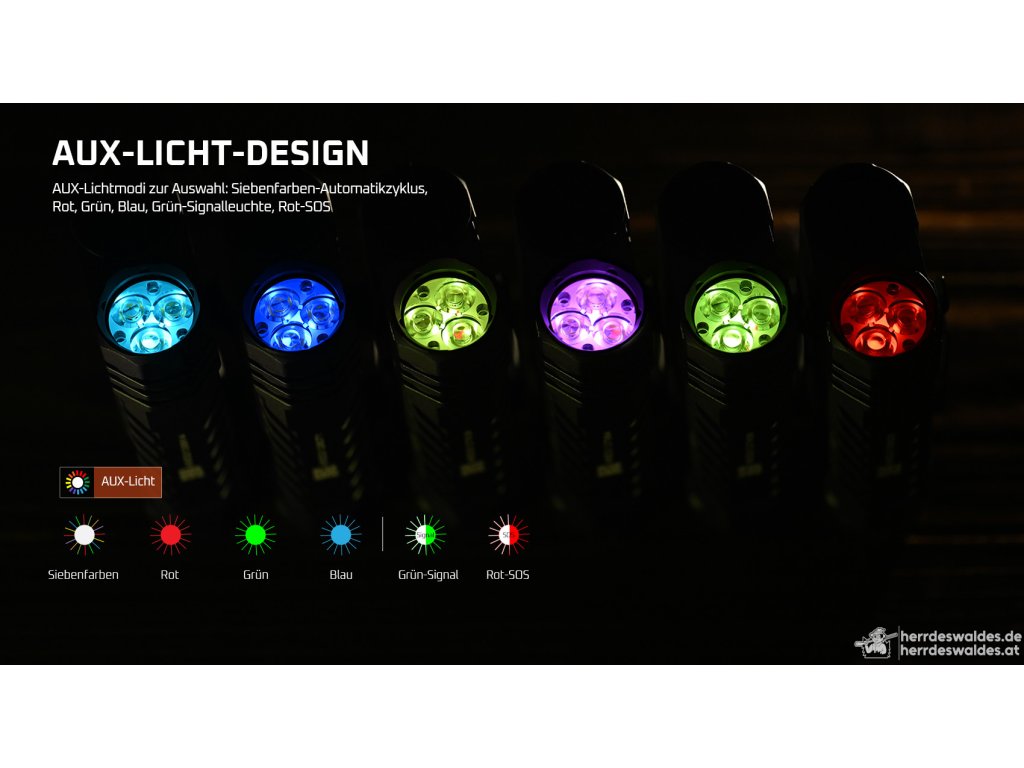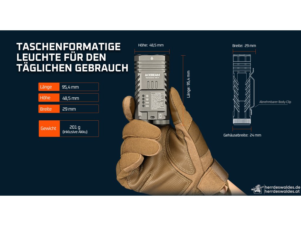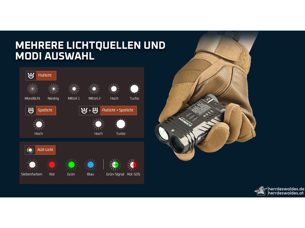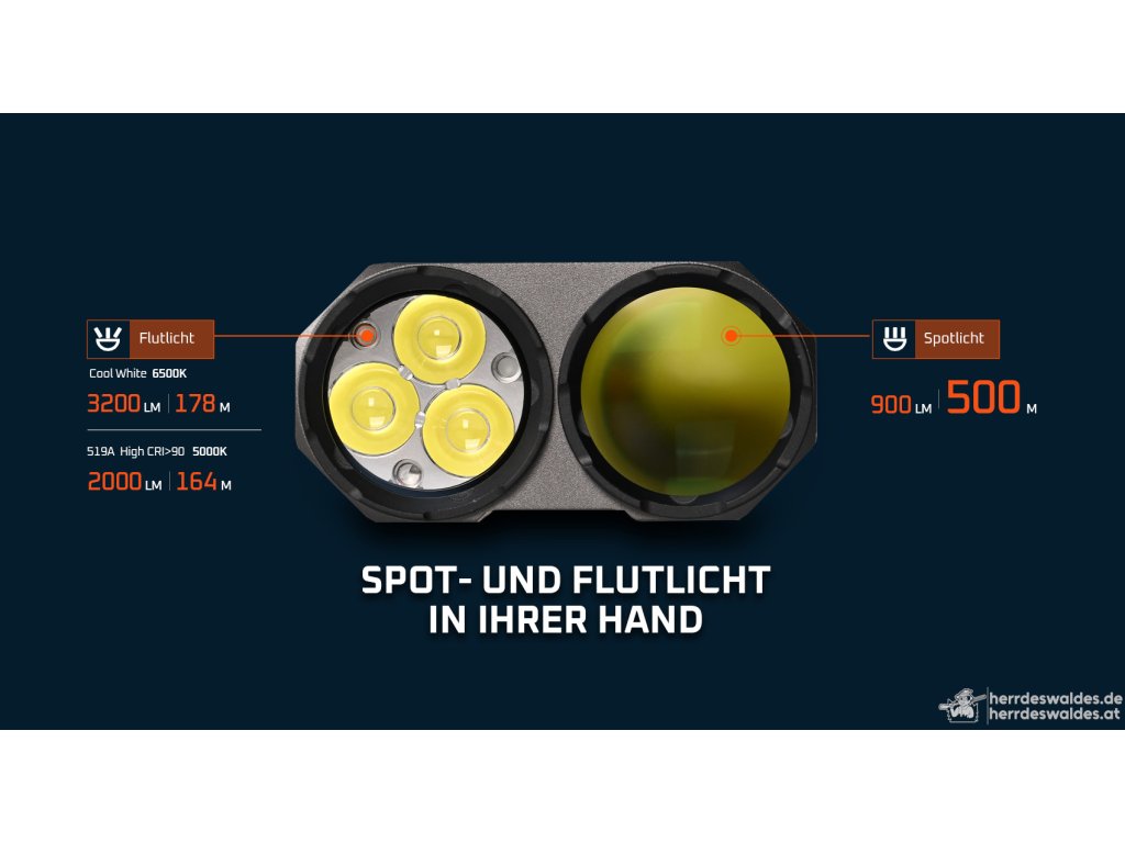 - LED: 3x Nichia 519A CRI90, 1x LED Spotlight 6500K CW und RGB LEDs - Lichtstrom 2000 lm (im Spot-Reflektor-Modus 900 lm) - Farbtemperatur Flutlicht 5000K (Tageslichtweiß) - Farbtemperatur Spot-Reflektor 6500K (Kaltweiß) - Helligkeit 62.500 nt - Reichweite 500 m (im Spot-Reflektor-Modus) - 15 Lichtmodi (Moonlight, Low, Medium1, Medium2, High, Turbo, High (Spot-Reflektor), High (Spot-Reflektor + Flutlicht), Stroboskop (Spot + Flutlicht), sieben Farben, Rot, Grün, Blau, grünes Signal und rotes SOS) - Doppelte Kopfform - Gewicht 201,1 g mit Akku - IP68 (bis 2 Meter Wassertiefe) - Fallfestigkeit aus 1,5 m Höhe - Betrieb mit 1x 18650 Akku - Aufladung über USB-C-Port im Akku integriert - Batterie-Statusanzeige - Anzeige des gewählten Lichtmodus - Gehäuse aus Aluminiumlegierung mit HAIII-Beschichtung, besonders widerstandsfähig gegen mechanische Beschädigungen - Gehärtetes ultraklares Glas mit Antireflexbeschichtung - Kann aufrecht stehen und als Kerze verwendet werden - Zwei Schalter - Farbe: Grau - Abnehmbarer Stahlclip
