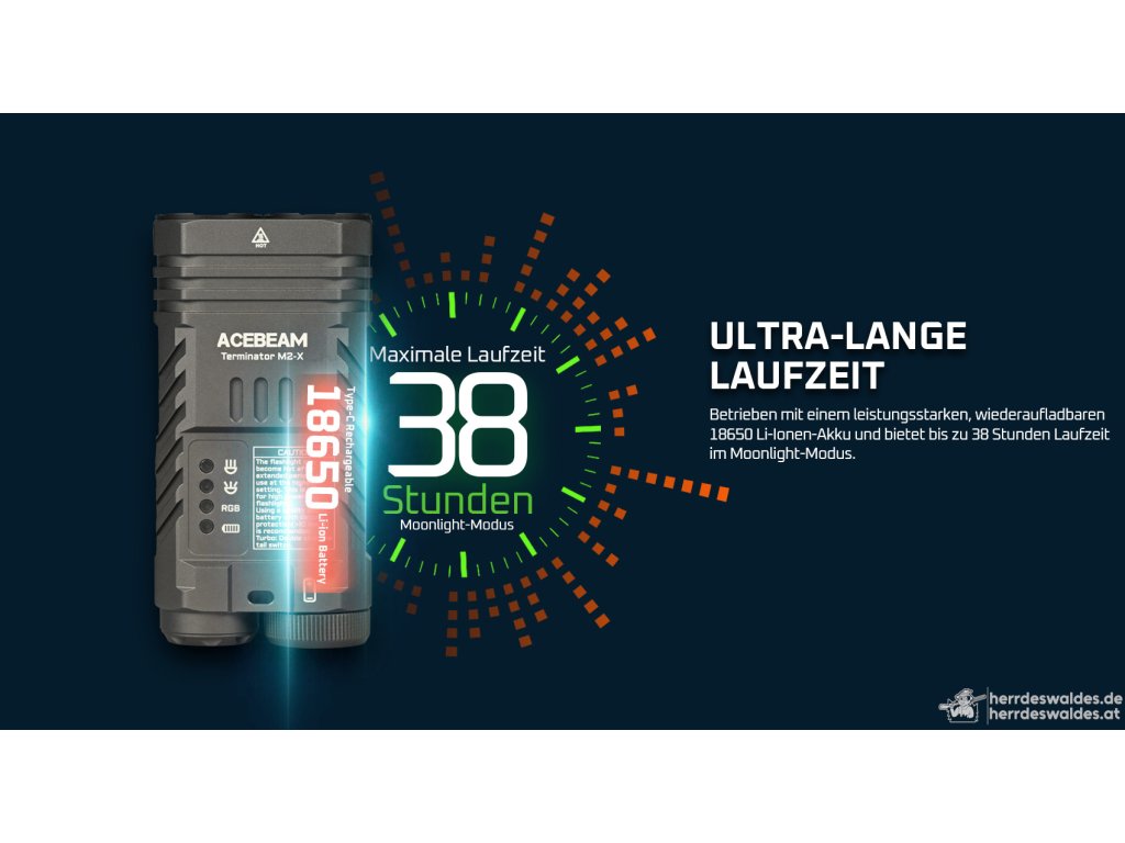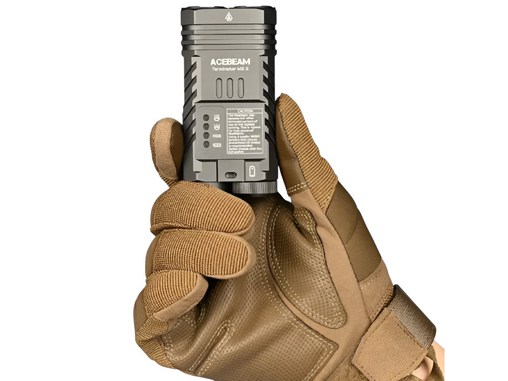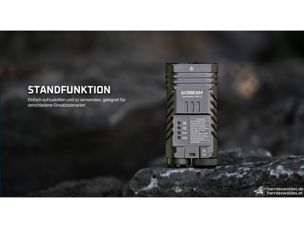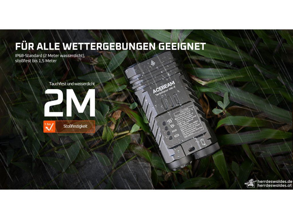 AceBeam Terminator M2-X ist die leichtere Version des bahnbrechenden Modells M1. M2-X funktioniert nach demselben Prinzip, d. h. der Kombination aus Flutlicht und Spot-Reflektor, wobei in beiden Varianten LED-Technologie eingesetzt wird. Neu hinzugekommen sind RGB-LEDs, die die Möglichkeit einer farbigen Beleuchtung bieten. All das in einem kompakten und leichten Gehäuse, ideal für den täglichen Gebrauch. Die Intensität kann zwischen fünfzehn (!) Modi umgeschaltet werden – Moonlight, Low, Medium1, Medium2, High und Turbo, wobei im Turbo-Modus eine Leistung von 2000 Lumen mit einem CRI90-Wert erreicht wird. Außerdem gibt es einen Modus für Spot-Reflektor mit hoher Leistung, eine Kombination aus Spot- und Flutlicht bei hoher Leistung sowie Stroboskop, und nicht zuletzt verschiedene RGB-Modi wie Wechsel von sieben Farben, rotes, grünes und blaues Licht, grünes Signallicht und rotes SOS. Die Taschenlampe merkt sich nach dem Ausschalten die zuletzt gewählte Helligkeit und schaltet beim nächsten Einschalten in diesen Modus zurück.