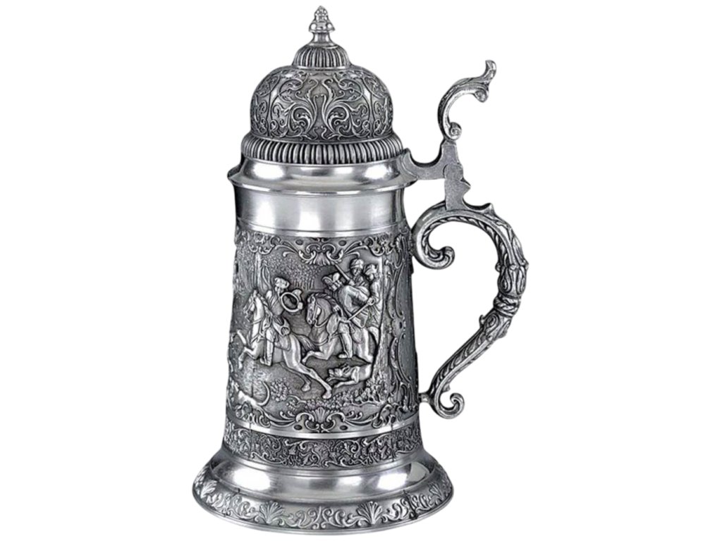 Verzierter Krug mit Deckel und Motiv der Parforcejagd vom österreichischen Hersteller Artina. Der Krug besteht aus einer Zinnlegierung mit einem Zinnanteil von mindestens 95 %. Die Legierung ist lebensmittelecht und kontaminiert weder Speisen noch Getränke, daher ist die Verwendung vollkommen sicher. Nicht spülmaschinengeeignet.