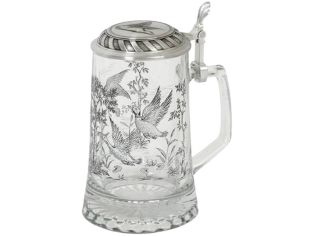 Bierkrug mit Deckel mit handbemaltem Glas und einem Zinn-Deckel mit Entenkopf vom österreichischen Hersteller Artina. Der Zinnanteil des Deckels beträgt mindestens 95 %. Die Legierung ist lebensmittelecht und kontaminiert weder Speisen noch Getränke, daher ist die Verwendung vollkommen sicher. Nicht spülmaschinengeeignet.