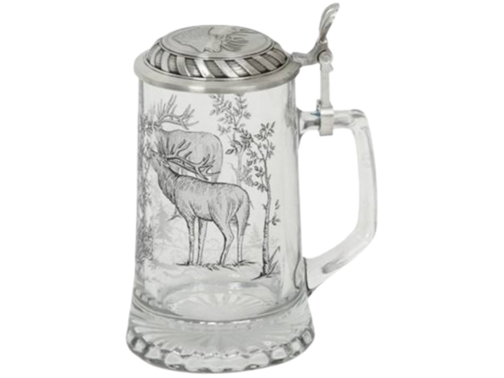 Bierkrug mit Deckel mit handbemaltem Glas und einem Zinn-Deckel mit Hirschkopf vom österreichischen Hersteller Artina. Der Zinnanteil des Deckels beträgt mindestens 95 %. Die Legierung ist lebensmittelecht und kontaminiert weder Speisen noch Getränke, daher ist die Verwendung vollkommen sicher. Nicht spülmaschinengeeignet.