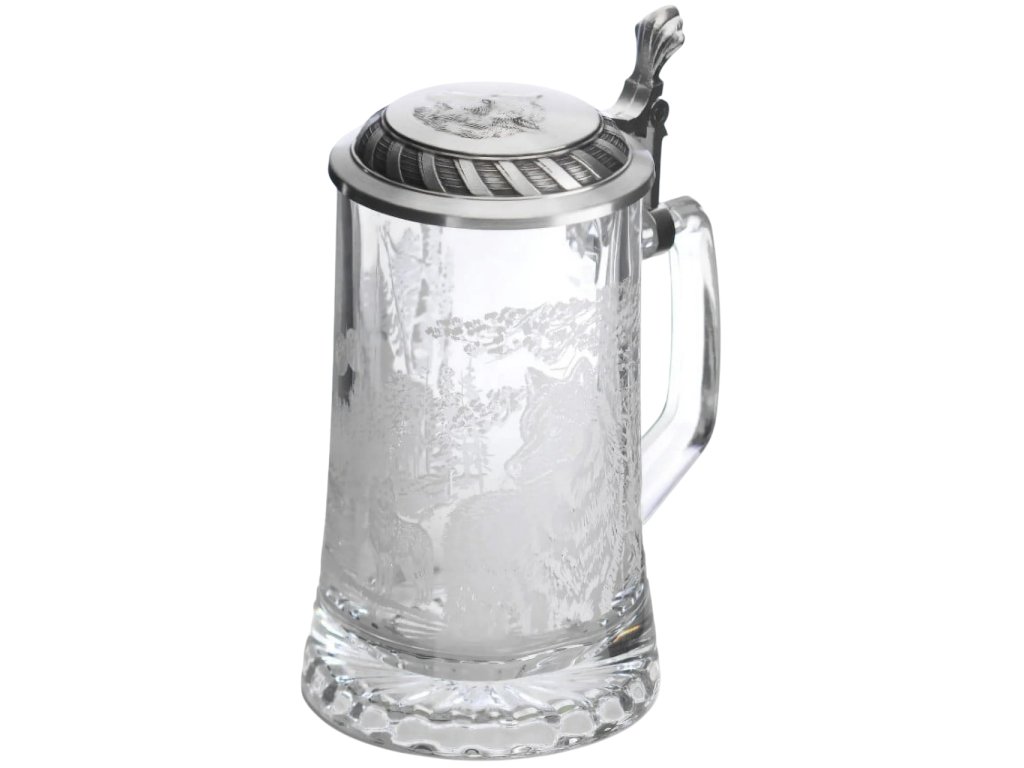 Bierkrug mit Deckel mit handbemaltem Glas und einem Zinn-Deckel mit Wolfskopf vom österreichischen Hersteller Artina. Der Zinnanteil des Deckels beträgt mindestens 95 %. Die Legierung ist lebensmittelecht und kontaminiert weder Speisen noch Getränke, daher ist die Verwendung vollkommen sicher. Nicht spülmaschinengeeignet.