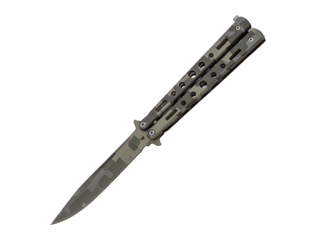 Importmarke JKR des spanischen Herstellers Joker aus der traditionellen Messerschmiedestadt Albacete. JKR Butterflymesser, Tarnmuster, Grün ist ein idealer Begleiter für den täglichen Gebrauch – vor allem dank seines sehr geringen Gewichts und der ausreichend langen Klinge. Das Klappmesser im „Butterfly“-Design besticht durch seine ansprechende grüne Camouflage-Optik. Die sehr einfache Konstruktion überzeugt durch hochwertige Verarbeitung.