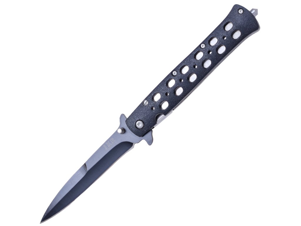 Importmarke JKR des spanischen Herstellers Joker aus der traditionellen Messerschmiedestadt Albacete. JKR Klappmesser, 10 cm, Aluminium, Schwarz ist ein hervorragender Begleiter für den täglichen Gebrauch, vor allem dank seines sehr geringen Gewichts und der ausreichend langen Klinge. Das Messer verfügt außerdem über eine innere Arretierung gegen unbeabsichtigtes Schließen, schwarze Griffschalen aus Aluminium sowie eine Glasbrecherspitze. Die Kombination aus Schwarz und Stahl wirkt sehr elegant.