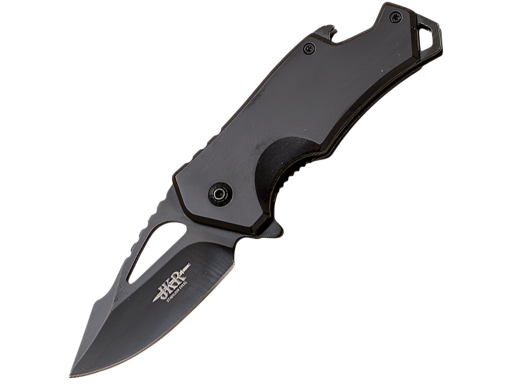JKR ist eine Marke des spanischen Herstellers Joker. JKR-Messer zeichnen sich durch ein hervorragendes Preis-Leistungs-Verhältnis aus und bieten somit erschwingliche Messer für ein breites Spektrum von Anwendern. JKR Klappmesser, 7,1 cm, Aluminium, Schwarz ist ein idealer Begleiter für den täglichen Gebrauch, dank seines sehr geringen Gewichts und der ausreichend langen Klinge. Das Messer verfügt über eine innere Sicherung gegen unbeabsichtigtes Einklappen, Aluminiumgriffschalen und am Griffende über einen Flaschenöffner. Die einfache Konstruktion überzeugt durch hochwertige Verarbeitung.