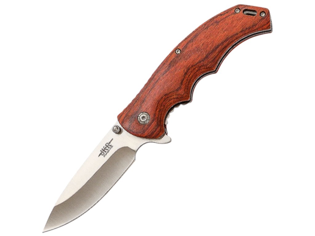 Importmarke JKR des spanischen Herstellers Joker aus der traditionellen Messerschmiede-Stadt Albacete. JKR Klappmesser, 8,2 cm, Rotes Holz ist ein hervorragender Begleiter für den täglichen Gebrauch, vor allem dank seines sehr geringen Gewichts und der ausreichend langen Klinge. Das Messer verfügt außerdem über eine innere Sicherung gegen unbeabsichtigtes Einklappen, Griffschalen aus rotem imprägniertem Holz, einen Stahlclip und Ösen am Ende des Messers zum Durchziehen einer Schnur. Die konstruktiv sehr einfache Bauweise überzeugt durch hochwertige Verarbeitung.