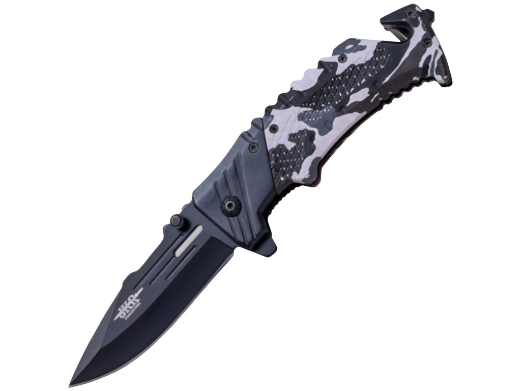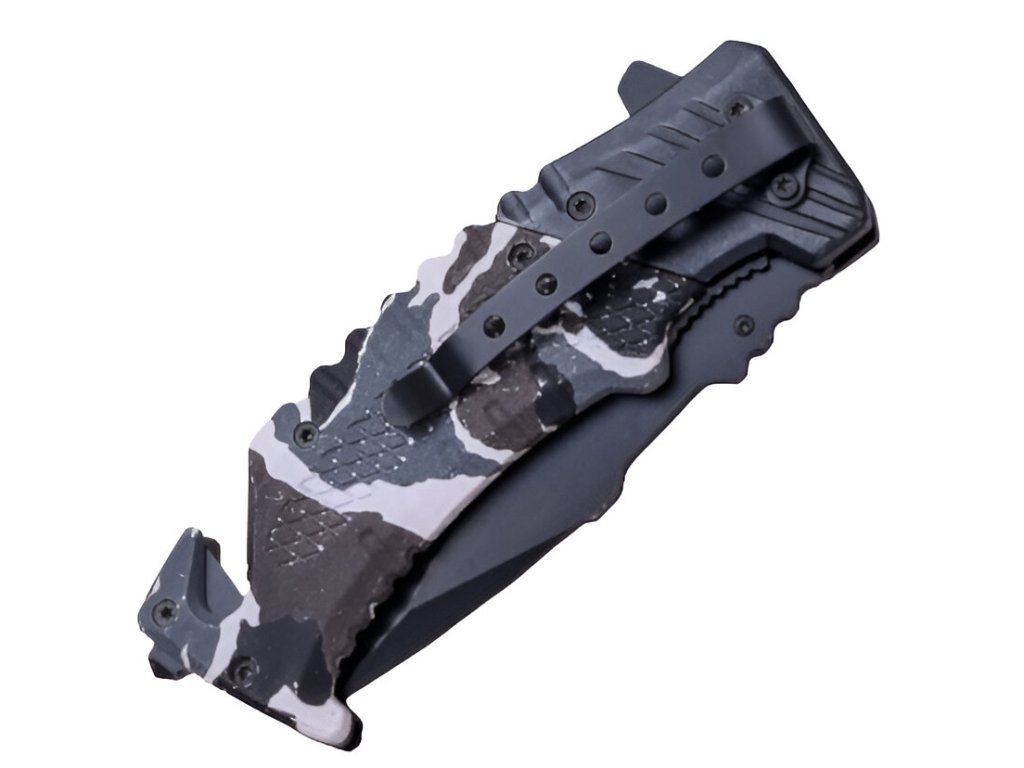 Importmarke JKR des spanischen Herstellers Joker aus der traditionellen Messerschmiedestadt Albacete. JKR Klappmesser, 8,5 cm, Winter-Tarnmuster, Aluminium, Schwarz-Weiß ist ein idealer Begleiter für den täglichen Gebrauch – vor allem dank seines sehr geringen Gewichts und der ausreichend langen Klinge. Das Messer verfügt über eine innere Sicherung gegen unbeabsichtigtes Einklappen, Griffschalen aus Kunststoff mit Winter-Tarnmuster sowie über einen Glasbrecher und einen Sicherheitsgurtschneider am Griffende. Die sehr einfache Konstruktion überzeugt durch hochwertige Verarbeitung.