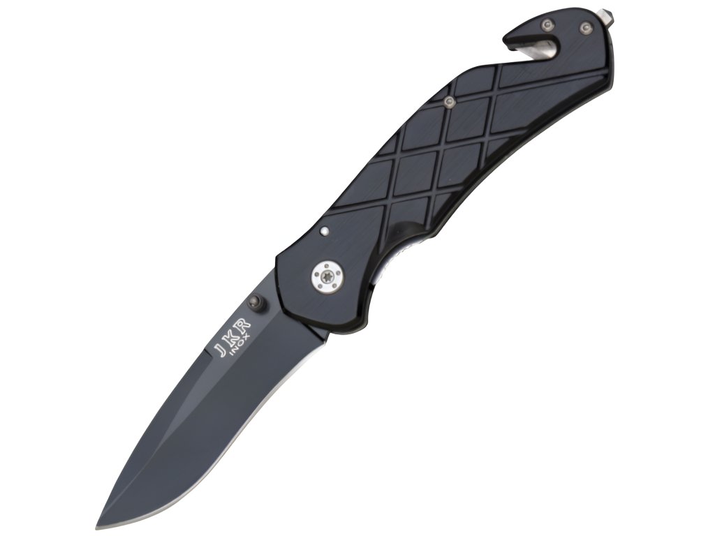Importmarke JKR des spanischen Herstellers Joker aus der traditionellen Messerschmiedestadt Albacete. JKR Klappmesser, Aluminium, Schwarz ist ein idealer Begleiter für den täglichen Gebrauch – vor allem dank seines sehr geringen Gewichts und der ausreichend langen Klinge. Das Messer verfügt über eine innere Sicherung gegen unbeabsichtigtes Einklappen, schwarze Griffschalen aus Aluminium und am Griffende über einen Glasbrecher sowie einen Gurtschneider. Die Kombination aus Schwarz und Stahl wirkt sehr elegant.