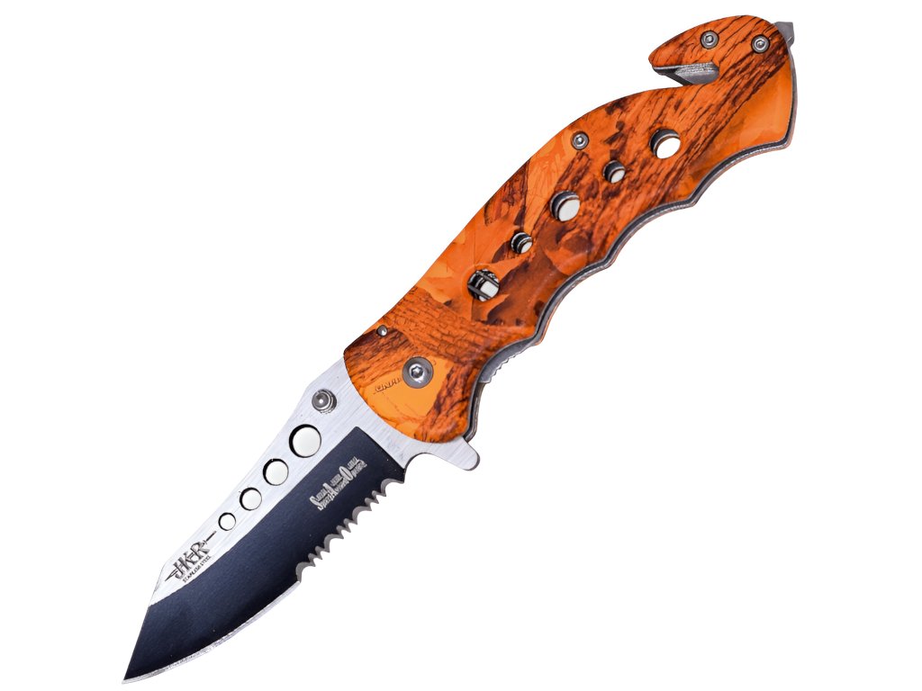 Die Importmarke JKR des spanischen Herstellers Joker aus der traditionellen Messerschmiedestadt Albacete. JKR Klappmesser, 8 cm, orangefarbene Tarnung, Aluminium ist ein hervorragender Begleiter für den täglichen Gebrauch – insbesondere dank seines sehr geringen Gewichts und der ausreichend langen Klinge. Das Messer verfügt über eine Sägezahnung, eine innere Sicherung gegen unbeabsichtigtes Schließen, Griffschalen aus Aluminium mit orangefarbener Tarnung sowie einen Glasbrecher und einen Sicherheitscutter am Griffende. Die konstruktiv einfache Ausführung überzeugt durch hochwertige Verarbeitung.