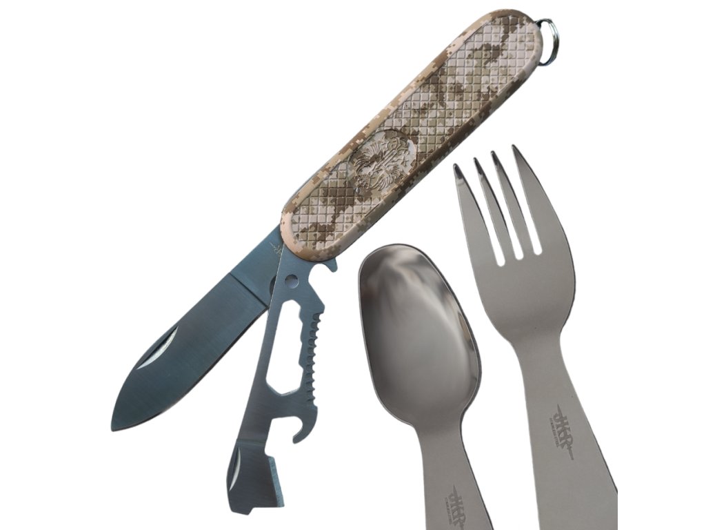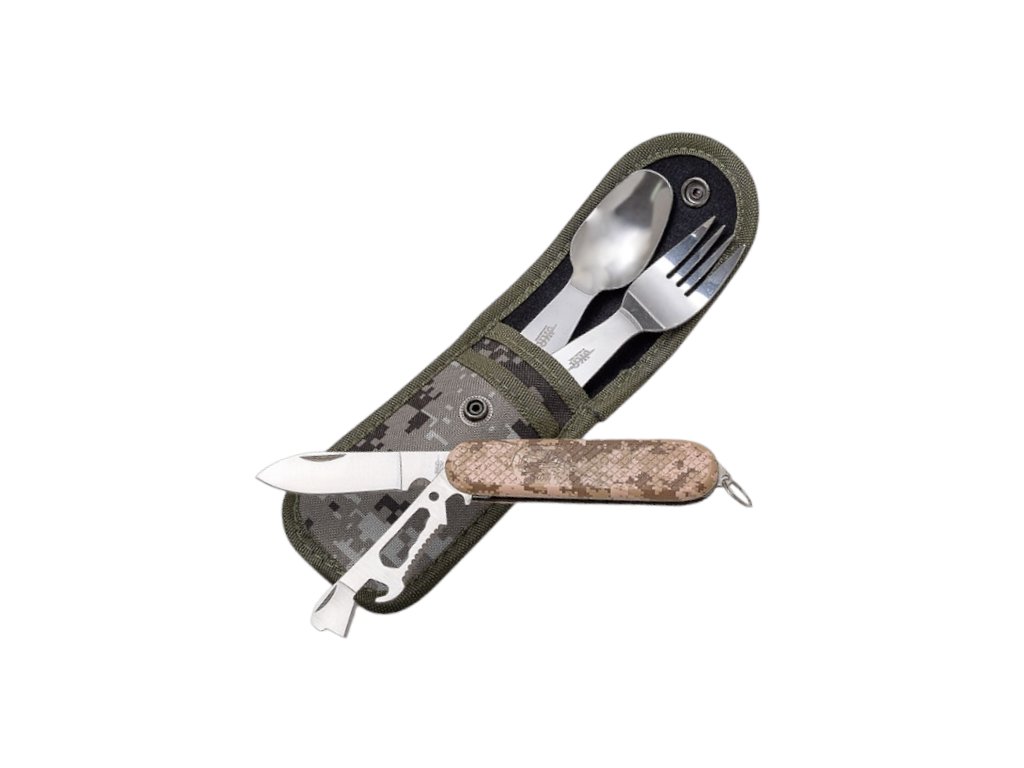 JKR Multifunktionsmesser mit Besteckset, 7,5 cm, Pixel-Tarnmuster, Sandfarben