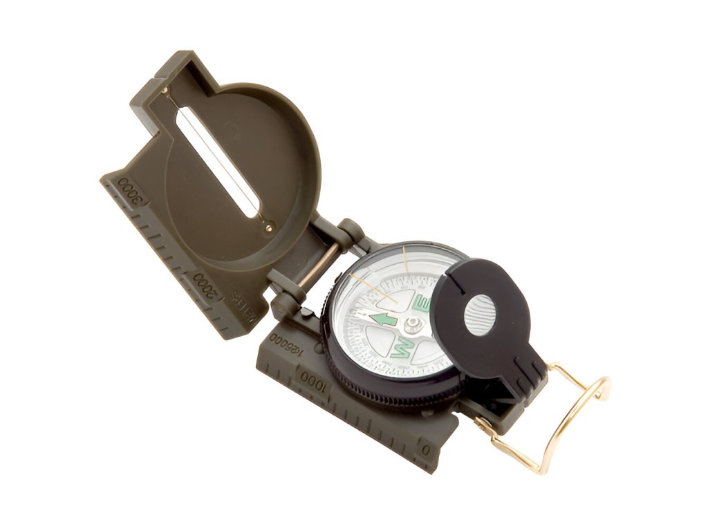 Moderne Nachbildung des klassischen Ranger-Kompasses, wie er von der US-Armee verwendet wurde. Es handelt sich um einen Pionier-Zielkompass mit in Flüssigkeit gelagerter Nadel, Maßstab 1:25000, Lupe und phosphoreszierender Markierung der Himmelsrichtungen.