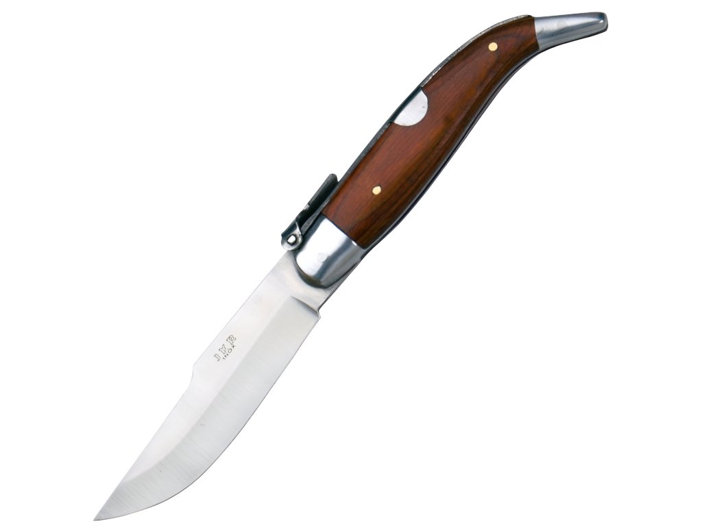 Importmarke JKR des spanischen Herstellers Joker aus der traditionellen Messerschmiedestadt Albacete. JKR Traditionelles spanisches Klappmesser, 8 cm, Rotes Holz gehört zu einer Serie, die sich auf die traditionellen spanischen Navaja-Messer bezieht. Erste Erwähnungen der Navaja-Messer stammen bereits aus dem 15. Jahrhundert. Diese Messer sind oft reich verziert, sei es an den Griffschalen oder am Rücken, ein weiteres markantes Merkmal ist die untypische Arretierung sowie das sehr schlanke Design.