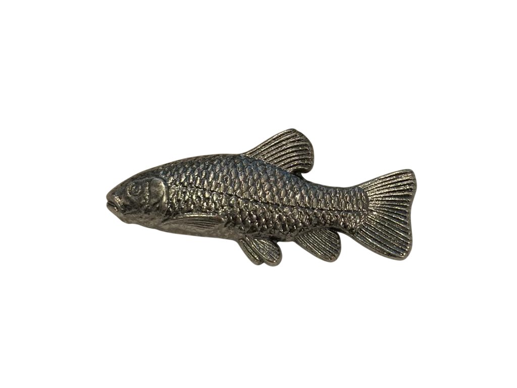 Ansteckabzeichen mit Pin zum Befestigen an der Kleidung vom spanischen Messerhersteller Joker mit Fischmotiv. Das Abzeichen hat die Maße 17,3 × 38,3 × 3,4 mm, zeichnet sich durch eine sehr detailreiche Ausführung aus und ist aus Metall gefertigt.