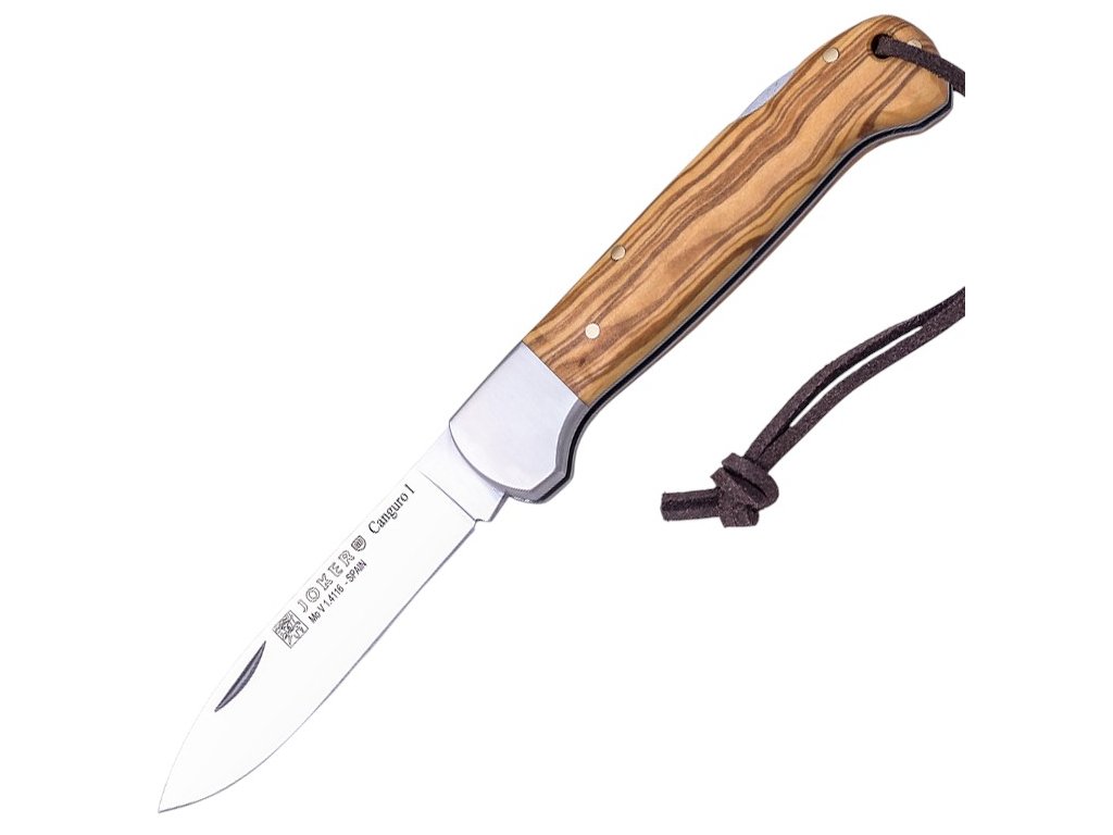Der spanische Hersteller Joker ist ein traditionsreicher Messermacher aus der bekannten Messerstadt Albacete. Das Canguro gehört zur Serie der Jagdmesser und ist dank seiner Variantenvielfalt ein hervorragender Begleiter für die Natur. Canguro I ist die Basisvariante dieses Bestsellers und verfügt über eine einzelne Klinge. Das Messer ist zudem mit einer externen Verriegelung gegen unbeabsichtigtes Schließen, einer Lederschnur sowie Griffschalen aus Olivenholz ausgestattet. Die hochrobuste Konstruktion wird durch eine sehr hochwertige Verarbeitung unterstrichen.