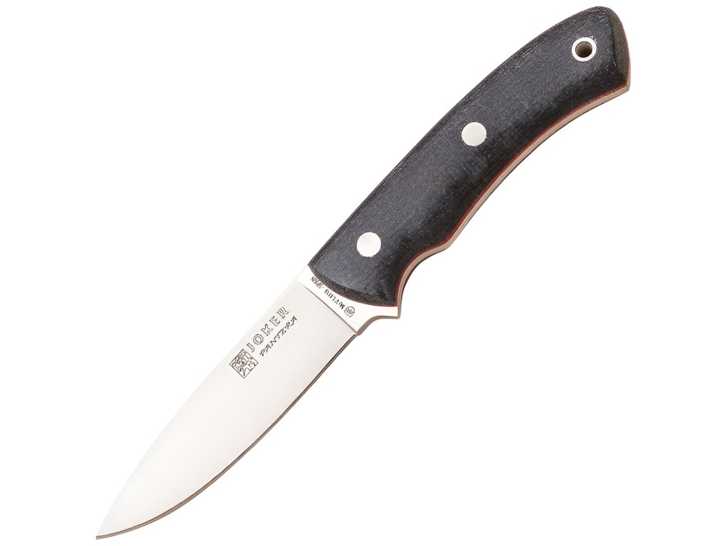 Der spanische Hersteller Joker stammt aus der traditionellen Messermetropole Albacete. Das Messer Pantera gehört zur Serie der Bushcraftmesser und zeichnet sich durch eine sehr hohe Klingenhärte aus, wodurch es selbst für die extremsten Bedingungen bestens geeignet ist. Bei der Entwicklung wurde großer Wert auf ausgezeichnete Handhabung gelegt – es liegt leicht in der Hand, besitzt aber dennoch genügend Gewicht für kraftvolles Hacken. Die ergonomischen Griffschalen aus Micarta sind ein elegantes Detail, das die Qualität dieses hervorragenden Messers unterstreicht.
